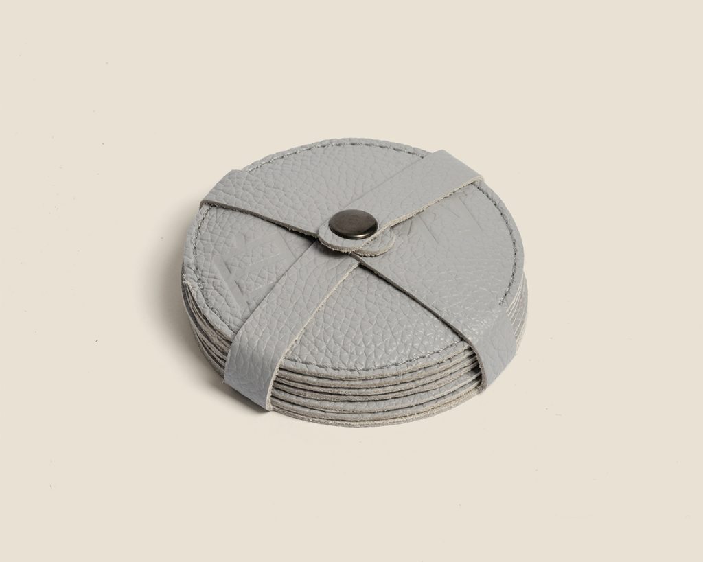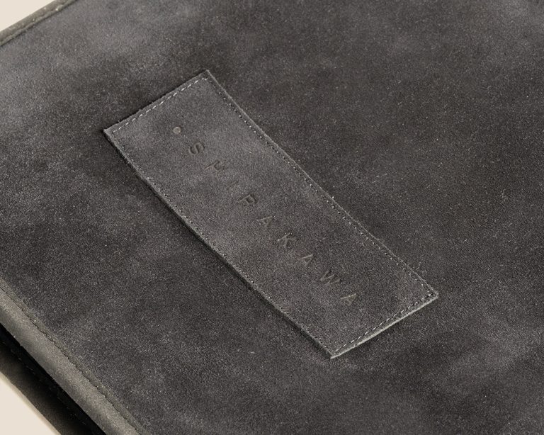 Leather napkin rings with gold rivets and embossed Shirakawa logo, adding subtle elegance to any table.